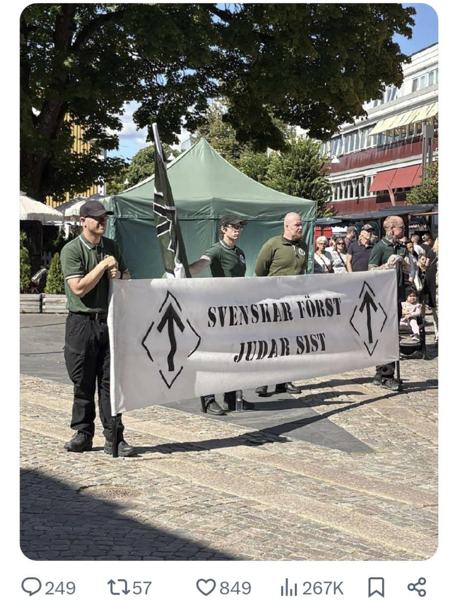 I helgen ägde stadsfesten Karl-Oskardagarna rum i Växjö. Under lördagen (16/8) genomförde nazistiska Nordiska motståndsrörelsen (NMR) en antisemitisk demonstration i centrala delarna av stan där man delade ut propagandablad och vecklade ut en stor banderoll med texten ”Svenskar först judar sist”.