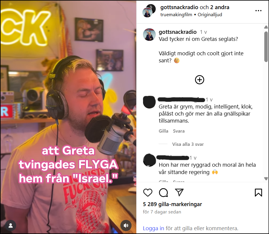 Fredrik ”Geniet” Söderholm, som tidigare var programledare för Tankesmedjan i P3, har med poddar som ”Gott snack” och ”Palestina under lupp” (den senare tillsammans med Paula Dahlberg, som även driver kontot ”Vardagsrasismen” på Instagram) utmärkt sig för en retorik som vinglar på gränsen mellan Israelkritik och antisemitism, och inte sällan ramlar ner på fel sida. Ett tydligt exempel på detta är den monolog Söderholm höll 11/6 i samband med Israels kortvariga tillfångatagande av Greta Thunberg. Det finns också en något nedkortad filmad version av talet. Där kan man se att han gör citattecken i luften när han säger ”Israel”. Vid annat tillfälle använder han uttrycket ”den sionistiska entiteten”.
